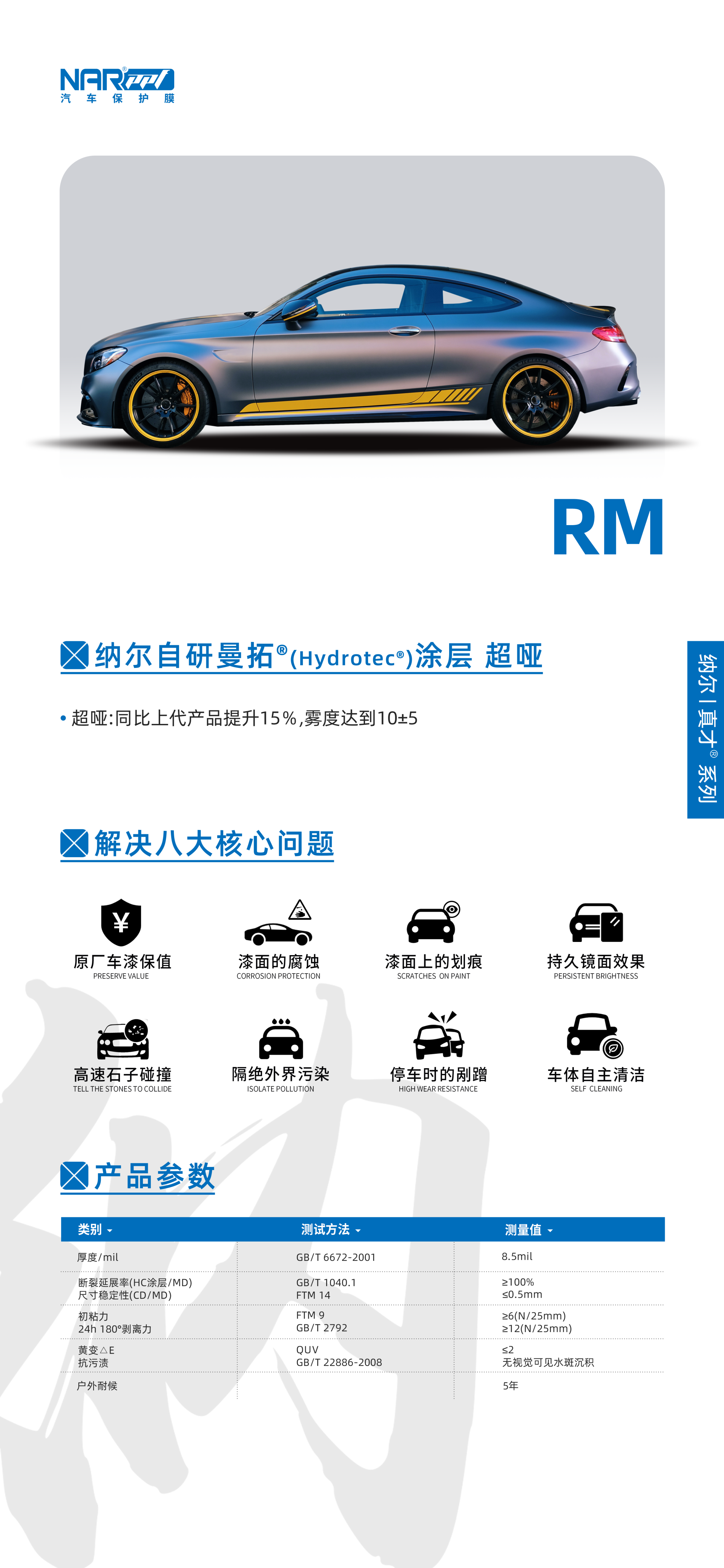 納爾自研曼拓®(Hydrotec®)涂層 超啞 超啞:同比上代產(chǎn)品提升15%,霧度達(dá)到10+5 彰顯品位,提升檔次 涂層賦予啞光質(zhì)感、手感絲滑 光線照射下呈現(xiàn)炫彩視覺效果,賦予車漆金屬啞光質(zhì)感