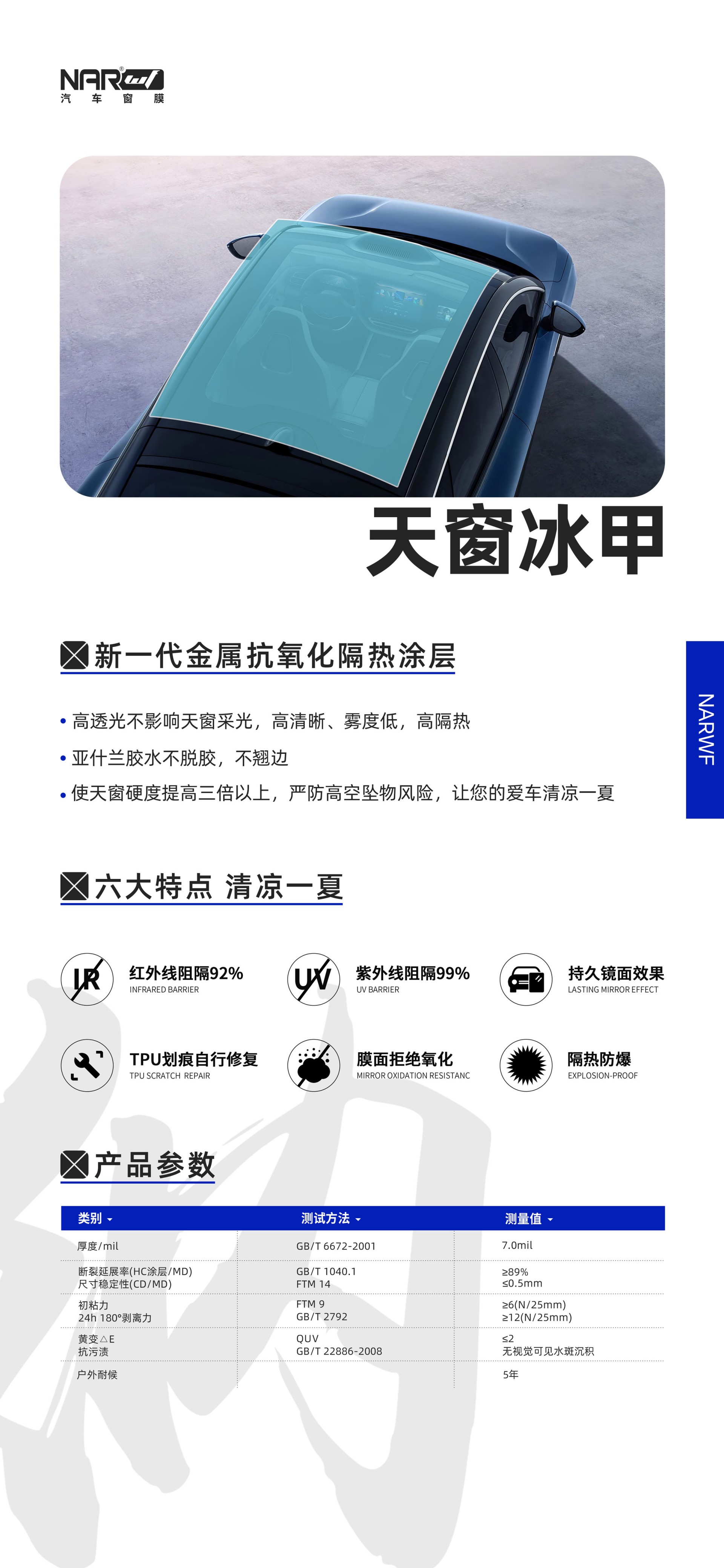 新一代金屬抗氧化隔熱涂層,高透光不影響天窗采光,高清晰霧度低,高隔熱,亞什蘭膠水不脫膠,不翹邊。使得天窗硬度提高三倍以上,嚴防高空墜物風(fēng)險,讓您的愛車清涼一夏!