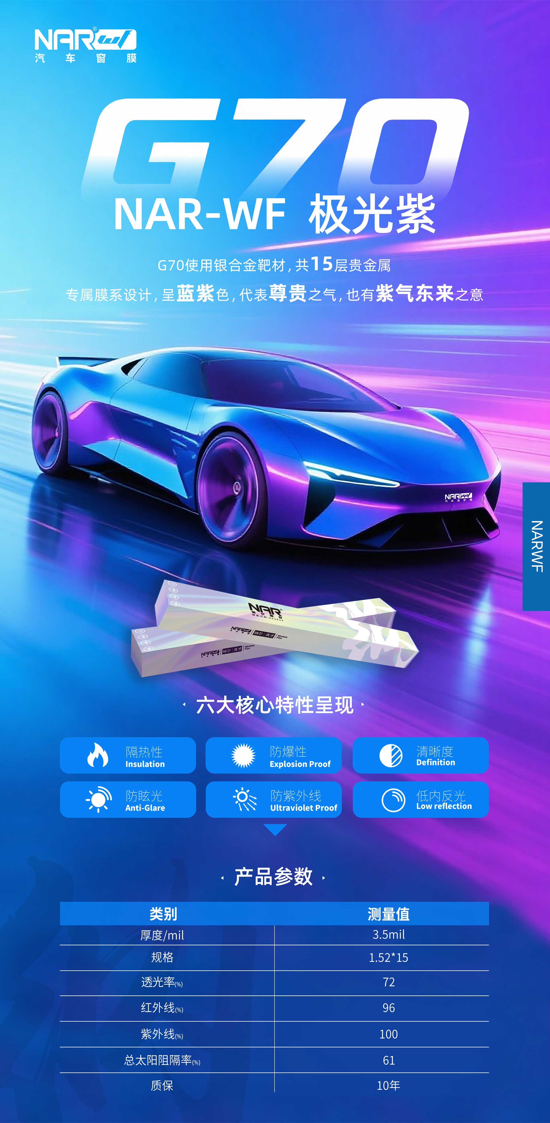 G70使用銀合金靶材,共15層貴金屬專屬膜系設(shè)計,呈藍紫色